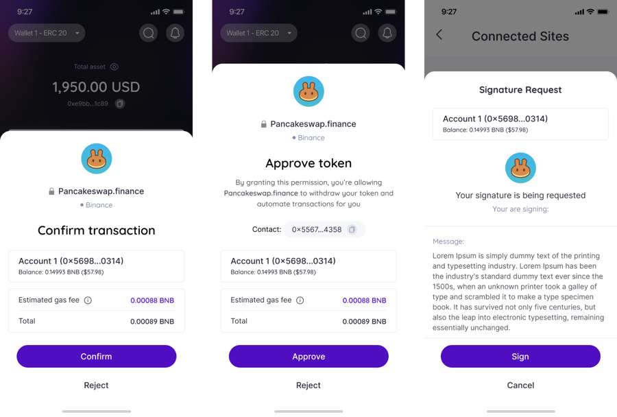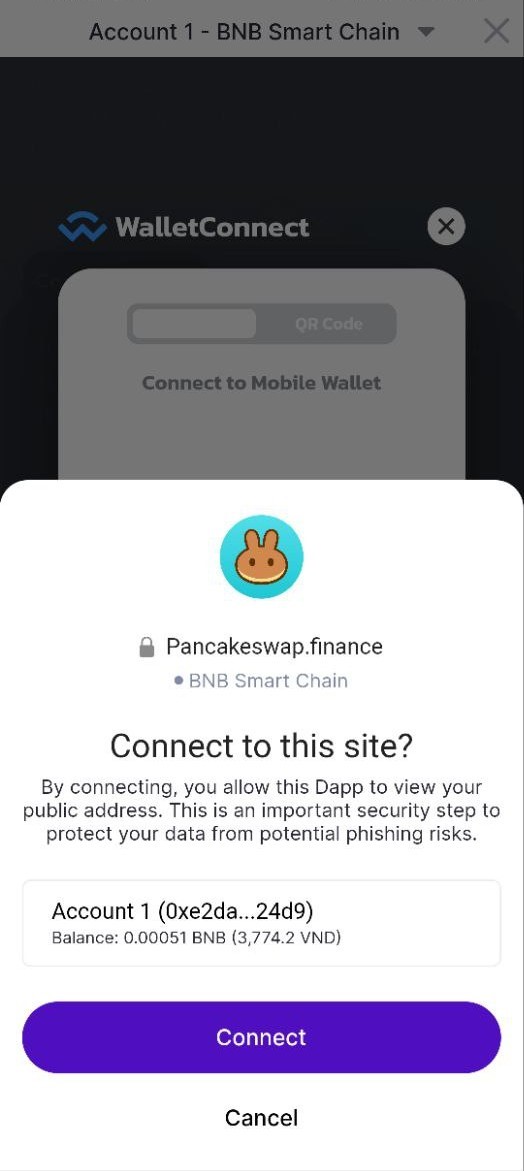 If you want to request "Sign message", "Approve token" and "Confirm transaction", please do not close the app in the middle of the WalletConnect sessions.