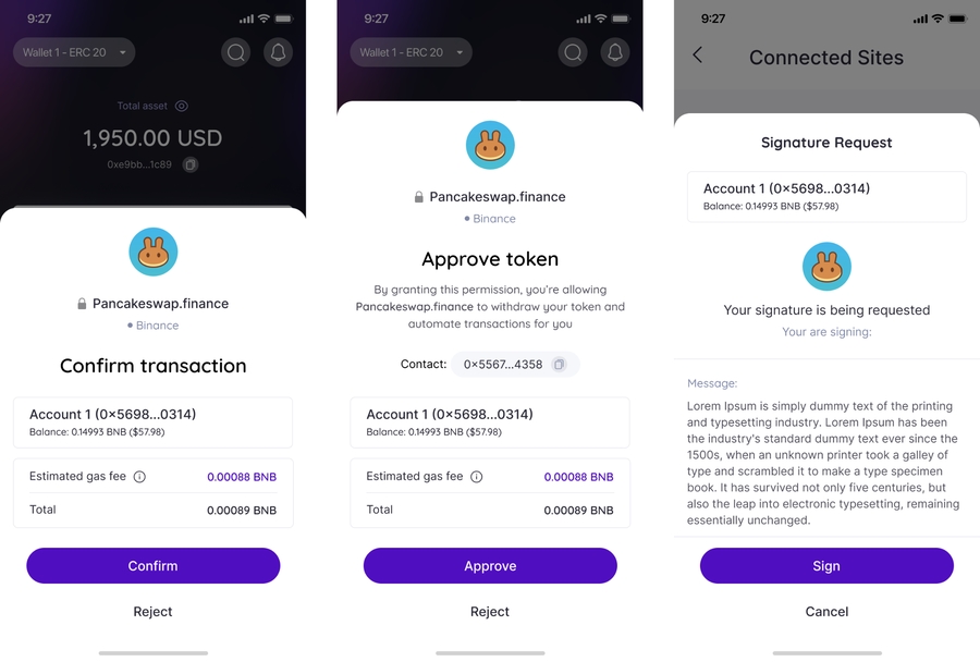 If you want to request "Sign message", "Approve token" and "Confirm transaction", please do not close the app in the middle of the WalletConnect sessions.